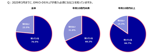 3. 不正対策としての本人認証のひとつであるEMV3-Dセキュア(以後、EMV3DS)導入の必須化を知っているのは、76.5%だった。