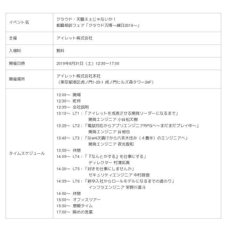 アイレット、現場のアイディアを活かしたエンジニア向けの転職相談フェア『クラウド万博〜縁日2019〜』を8/31(土)に東京・虎ノ門にて開催