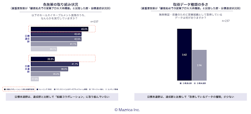 顧客起点での営業プロセス再構築に取り組んでいても、自社内における他組織との連携やデータの取得・活用を行えていない組織は目標の達成率が低い傾向。