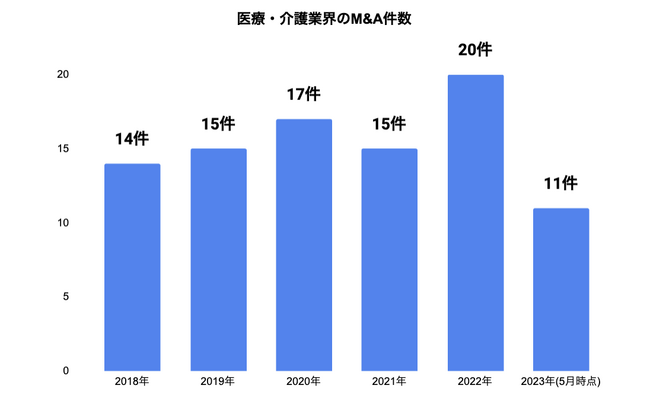 2018年〜2022年および2023年1月〜5月31日における医療・介護業のM&A成約件数は、2021年は前年の17件から2件減少となる15件(前年比△11.8%)でしたが、2022年は20件(前年比33.3%)と再び増加に転じました。