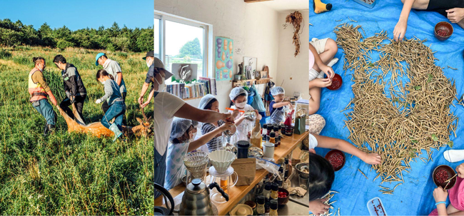 鹿の狩猟体験、オリジナルドレッシング作り、小豆の種取り作業の様子