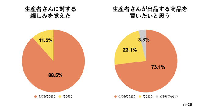生産者に親しみを覚えたかを問う設問では、88.5%の方が「とてもそう思う」、11.5%の方が「そう思う」と回答し、アクティビティを実施した生産者の商品を購入したいかを問う設問では、73.1%の方が「とてもそう思う」、23.1%の方が「そう思う」と回答しました。