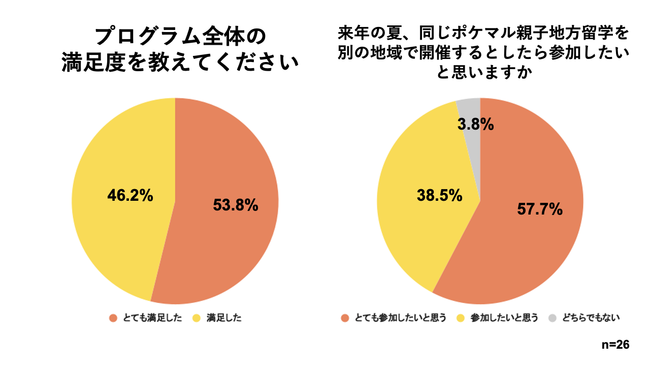 当社が「ポケマル親子地方留学」夏季長期プランに参加した親御さんを対象に実施したアンケートのプログラム全体の満足度を問う設問では、53.8%の方が「とても満足した」、46.2%の方が満足した」と回答しました。また、来年の夏に別地域で開催される場合の参加意欲を問う設問では、57.7%の方が「とても参加したいと思う」、38.5%の方が「参加したいと思う」と回答しました。