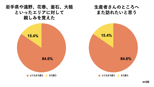 また、開催地に親しみを覚えたかを問う設問と、アクティビティを実施した生産者のもとへ再訪したいかを問う設問では、いずれも84.6%の方が「とてもそう思う」と回答しています。