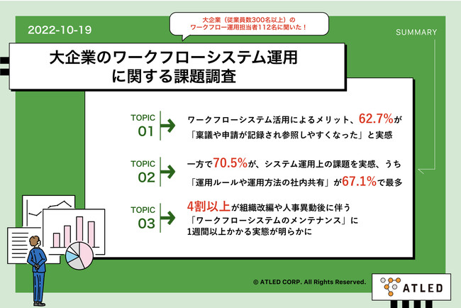株式会社エイトレッド(本社:東京都渋谷区、代表取締役社長:岡本 康広 以下、エイトレッド)は、大企業(従業員数300名以上)のワークフロー運用担当者112名に対し、大企業のワークフローシステム運用に関する課題調査を実施いたしましたので、お知らせいたします。