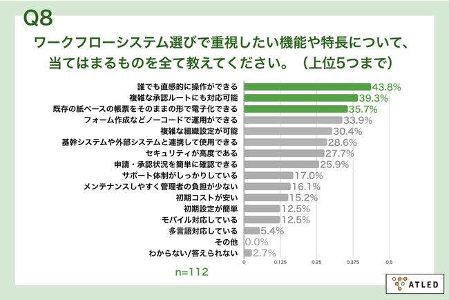 「Q8.あなたが、ワークフローシステム選びで重視したい機能や特長について、当てはまるものを全て教えてください。(上位5つまで)」(n=112)と質問したところ、「誰でも直感的に操作ができる」が43.8%、「複雑な承認ルートにも対応可能」が39.3%、「既存の紙ベースの帳票をそのままの形で電子化できる」が35.7%という回答となりました。