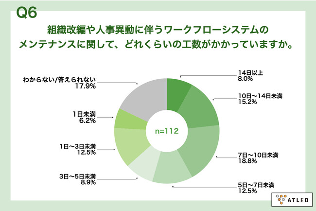 「Q6.あなたのお勤め先では、組織改編や人事異動に伴うワークフローシステムのメンテナンスに関して、どれくらいの工数がかかっていますか。」(n=112)と質問したところ、「7日〜10日未満」が18.8%、「10日〜14日未満」が15.2%という回答となりました。