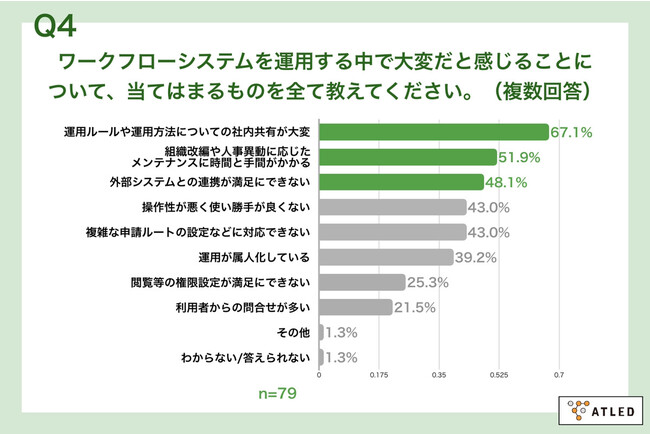 Q3で「非常にある」「ややある」と回答した方に、「Q4.あなたが、自社のワークフローシステムを運用する中で大変だと感じることについて、当てはまるものを全て教えてください。(複数回答)」(n=79)と質問したところ、「運用ルールや運用方法についての社内共有が大変」が67.1%、「組織改編や人事異動に応じたメンテナンスに時間と手間がかかる」が51.9%、「外部システムとの連携が満足にできない」が48.1%という回答となりました。