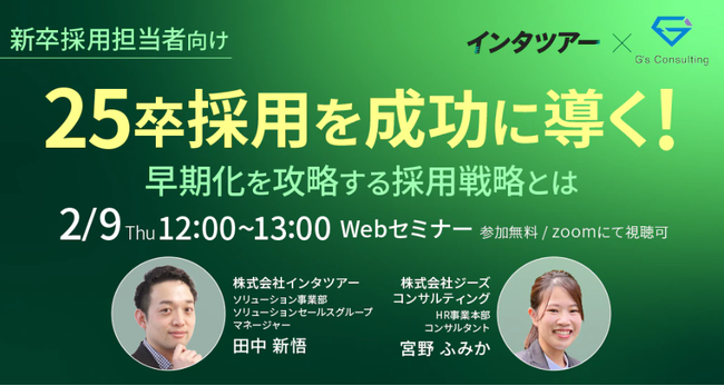 新卒採用向けのリレーション採用プラットフォームを提供する(株)インタツアー(代表:作馬 誠大、本社:東京都港区浜松町)は、2023年2月9日(木)に、新卒採用担当者向けオンラインセミナー『25卒採用を成功に導く!〜早期化を攻略する採用戦略とは〜』を開催いたします。