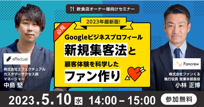 Googleビジネスプロフィール管理やMEO対策等、自社SaaSプロダクトを用いてオンラインブランドマネジメントのDX化を支援する株式会社エフェクチュアル(本社:東京都港区、代表取締役:田中倫明)は、5月10日(水)に「Googleビジネスプロフィール新規集客法と顧客体験を科学したファン作り」と題し、株式会社ファンくる(本社:東京都千代田区、代表取締役社長 山口敬人)と共催で飲食店向けのオンラインセミナーを開催いたします。