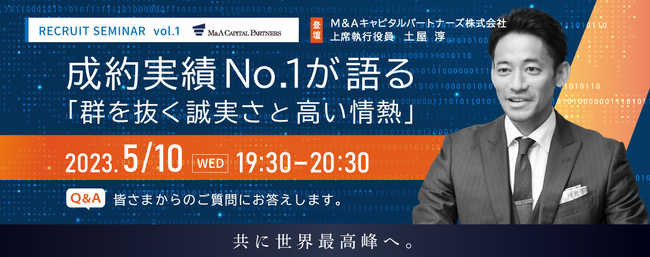 M&Aキャピタルパートナーズ株式会社(東京都中央区・代表取締役社長 中村 悟) は、2005年の創業以来初となる採用イベントの第一弾として、2023年5月10日(水)19:30〜20:30に、リクルートセミナーを開催することをお知らせいたします。
