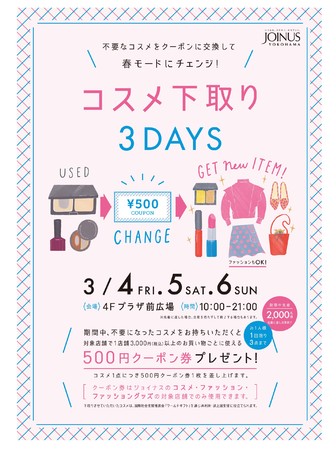 ポーチの中などに眠っている不要なコスメをお持ちいただくと、ジョイナスの対象店舗で3,000円(税込)以上のお買い物ごとに使える500円クーポン券がゲットできる、「コスメ下取り3DAYS」を実施。3月4日(金)から3月6日(日)まで3日間限定のチャンスです!もちろん、ジョイナスで購入していない商品や使用途中のコスメもお持ち込み可能です!下取りしたコスメは、国際社会支援推進会「ワールドギフト」を通じ再利用・途上国支援に役立てられます。商品のリユースを促進することで廃棄物を減らし、環境保護に貢献してまいります。