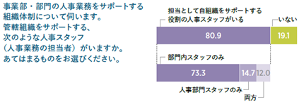 人事の組織体制について、自組織担当の人事スタッフがいるとの回答が80.9%。その内訳として、部門内スタッフのみである場合が73.3%、人事部門スタッフのみである場合が14.7%、両方に自組織担当の人事スタッフがいる場合が12.0%であった。