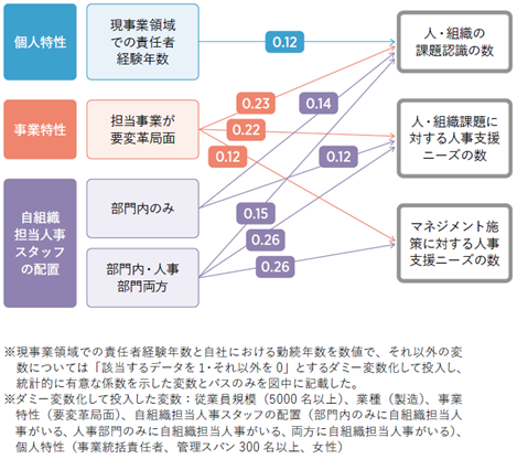 また、部門内と人事部門の両方に自組織担当の人事スタッフがいる場合には、人事支援ニーズの数が多くなることも確認された。この効果は、部門内のみに自組織担当人事スタッフがいる場合では見られなかった。部門内と人事部門の両方に自組織担当の人事スタッフがおり、連携していることで、人事からどのような支援が受けられるかという情報が具体的に得られることの効果と考えられる。