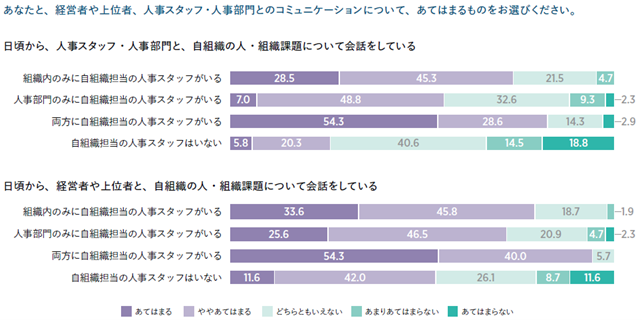 図表2は、自組織担当の人事スタッフの有無別に、日頃、人・組織課題についての会話がどの程度あるかをたずねたものである。自組織担当の人事スタッフがいる場合では、いない場合に比べて、人事スタッフ・人事部門、および経営者や上位者との人・組織課題についての会話が多い。組織内と人事部門の両方に自組織担当の人事スタッフがいる場合は、よりその傾向が強い。
