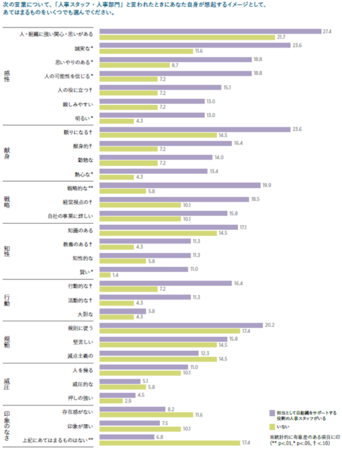図表3は、「人事スタッフ・人事部門」と言われたときに想起するイメージとしてあてはまる言葉を選んでもらったものである。自組織担当人事スタッフがいる場合は、回答者が選択するワードの数が増え、幅広いイメージワードが選択されている。「人・組織に強い関心・思いがある」「規則に従う」といった共通イメージに加え、「誠実な」「頼りになる」「戦略的な」「思いやりのある」「人の可能性を信じる」「経営視点の」といったイメージが加わる。