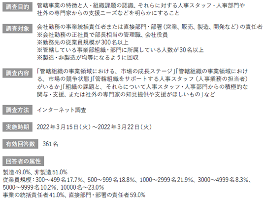 企業における経営・人事課題の解決および、事業・戦略の推進を支援する株式会社リクルートマネジメントソリューションズ(本社:東京都品川区 代表取締役社長:山崎 淳 以下、当社)は、2022年3月に事業統括責任者または直接部門・部署(営業、販売、製造、開発など)の責任者361名に対し、「人・組織課題解決の支援ニーズに関する調査」を実施し、調査結果を公表しました。