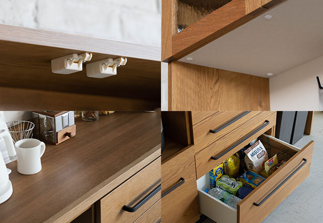 また、引出しも4杯あり開き収納も合わせれば、収納力も十分。開き戸には耐震ラッチがついており、地震を感知すると扉をロックし食器などが飛び出すのを防いでくれるので安心です。