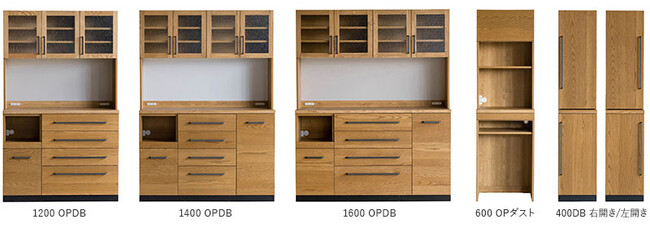 収納を増やしたい、ダストボックス用の収納スペースが欲しいなど、設置するスペースや使い方に合わせて、アイテムを追加・連結できるユニットシステムを採用。ダイニングボード3サイズ(1200/1400/1600)とダストボックス収納が1タイプ、400サイズの収納が2タイプ(右開き/左開き)の全6タイプをラインナップしています。