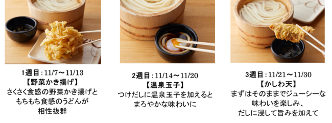 丸亀製麺の看板商品である『釜揚げうどん』をさらにおいしく楽しんでいただきたく、創業月の11月には麺職人がおすすめする『釜揚げうどん』と相性抜群の天ぷらやトッピングをお得に楽しめるアプリ限定クーポンを週替わりで進呈いたします。