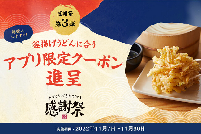 創業22周年を記念し、『釜揚げうどん』をより楽しめる感謝祭ならではの「アプリ限定クーポン」を丸亀製麺公式アプリにて期間限定で配信