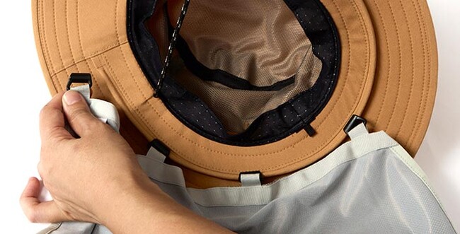 首回りの日よけに効果的な「レイルオンシステム」は、別売りの専用シェード(日よけ)を着脱できる独自機能です。レイルに取り付けたシェードの位置を調整することで、キャップ・ハットをかぶったままシェードの開き具合を変えることができます。シーンに合わせて首や顔を効果的に覆うことができるため、強烈な日差しが照り付ける登山やトレイルランニング、シーカヤックなどで活躍します。