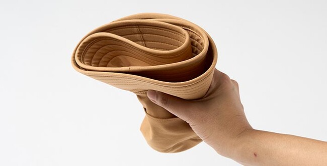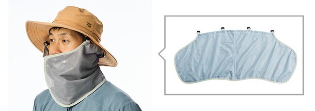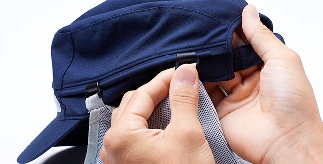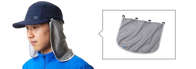 チタンスパッタリングのメッシュ生地(遮蔽率:紫外線86%、赤外線75%)を使用し、風を通しながら日差しと熱線を効果的に遮断します。首筋を覆うシェードと、ボタン留めで首から顔全体まで覆うフルシェードの2種類があります。