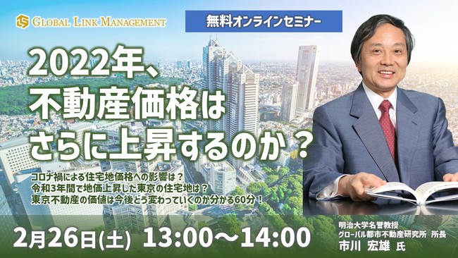 投資用不動産を扱う株式会社グローバル・リンク・マネジメント(本社:渋谷区、以下「GLM」)は、明治大学名誉教授 市川宏雄氏が登壇するセミナー「2022年、不動産価格はさらに上昇するのか?」を2022年2月26日(土)にオンライン形式で開催いたします。