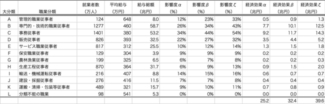 次に、LLM活用がもたらす業務効率化の価値を現状の日本の労働市場における給与実績から試算するため、国内の様々な公的統計データから企業規模ごとの年間給与平均額を割り出し、経済効果(alpha・beta・zeta)算出に利用しました。結果としては、現状のLLM機能を活用した場合の影響度(alpha)で年間約25兆円、将来的な機能追加が実装されたLLM機能を活用した場合の影響度(zeta)で年間約40兆円相当の労働価値を生む試算となりました。