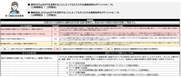 また、影響を受けるすべての業務タスクにおいて、効率化のためのプロンプト例や、活用アイディアも提供するため、既にChatGPTを導入している企業にとっても、更なる効率化が期待できます。