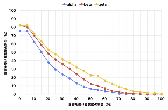 その論文手法を再現したアルゴリズムを適用した結果が下記の図で、現状のChatGPT(alpha)から将来のChatGPT(zeta)までの影響度のポテンシャルを表現しています。例えば、betaの影響度をみると業務の10%にLLMを活用できる職業は全職業の70%強におよび、業務の50%にLLMを活用できる職業は全職業の20%という解釈です。