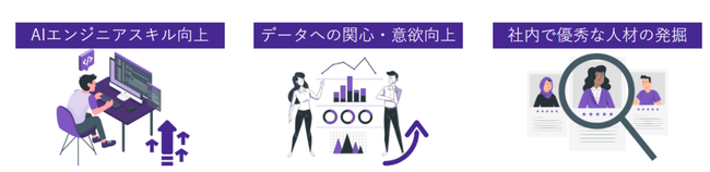 クローズドなデータ分析コンペティションを通じて、AI開発について学ぶ研修サービスです。実務に即したデータを用いて、参加者同士がAIの予測精度を競い合いながら、必要な知識を学んでいきます。