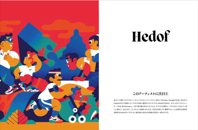 また、業界で注目を集める2人のアーティストへのインタビューも掲載。タピオカティーのパッケージから、IKEA、Googleの広告まで幅広く手がける「Hedof」、ミニマルな線と幾何学的なフォルムという独自表現で出版物や記念切手などのイラストを手がける「Jay Cover」の、作品背景やこれまでの道のりを知ることができます。