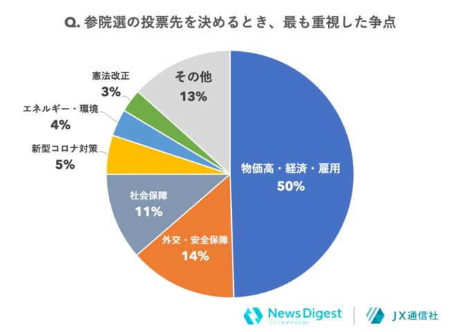 この調査企画の中で、6月23日から28日までの間に期日前投票を済ませた有権者の回答を集計した結果、投票先を決めるにあたって重視した争点として「物価高・経済・雇用」を挙げた有権者が最多の約5割に上りました。次いで、外交・安全保障(14%)、社会保障(11%)、新型コロナ対策(5%)、エネルギー・環境(4%)、憲法改正(3%)などと続いています。