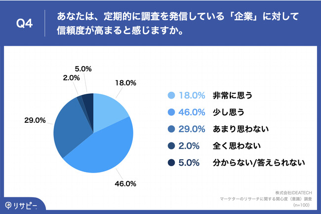 「Q4.あなたは、定期的に調査を発信している「企業」に対して信頼度が高まると感じますか。」(n=100)と質問したところ、「非常に思う」が18.0%、「少し思う」が46.0%という回答となりました。