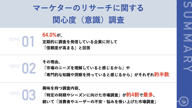 まず、マーケティング担当者の64.0%が、「定期的に調査を発信している企業に対して、信頼度が高まる」と回答しました。その理由として、「市場のニーズを理解していると感じるから」が最多となった他、「専門的な知識や洞察を持っていると感じるから」や「中立的で偏りのない情報提供を行っているから」なども挙がりました。また、「特定の時期やシーズンに向けた市場調査」や「消費者やユーザーの不安・悩みを吸い上げた市場調査」に、強い関心が寄せられていることが分かりました。今後、企業の施策として、「定期的な調査データの発信」が、市場から信頼を勝ち取る鍵となりそうです。