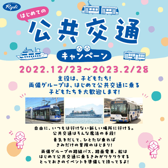 両備グループの岡山県内をエリアとする公共交通事業会社、両備ホールディングス株式会社両備バスカンパニー、岡山電気軌道株式会社、株式会社井笠バスカンパニー、東備バス株式会社、国際両備フェリー株式会社、瀬戸内観光汽船株式会社では、岡山県が現在実施中の公共交通乗車キャンペーンにあわせ、2022年12月23日(金)から2023年2月28日(火)まで、「はじめての公共交通キャンペーン」(https://ryobi.gr.jp/ryobi-hajimete/)と題し、お子様を対象とした様々なイベントやプレゼント企画を実施しますのでお知らせいたします。