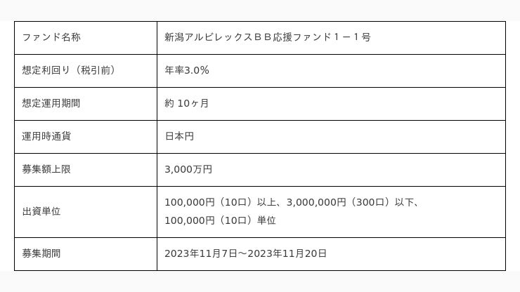 本ファンドは、投資家の皆様からの出資金をプロバスケットボールチーム「新潟アルビレックスBB」を運営している『株式会社新潟プロバスケットボール』(非上場)に対し、事業資金として貸付け運用するファンドです。