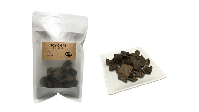 合同会社醸オープンラボと共同開発をした、大豆生地に発酵させたコーヒーかすを混ぜ込んだチップスを販売。糖質を心配せずにすむ、ヘルシーなスナック菓子となっています。醸オープンラボの独自の発酵技術により、短時間でタンパク質、アミノ酸、食物繊維を多く含む製品へアップサイクルすることが可能となりました。