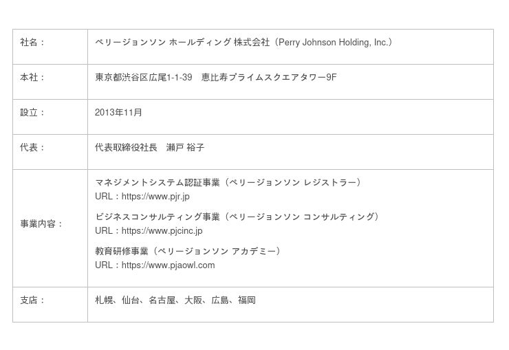 1994年に設立されたマネジメントシステムの第三者認証機関Perry Johnson Registrars, Inc.(本社:米国ミシガン州)の日本法人として、ISO 9001(品質)、ISO 14001(環境)、ISO/IEC 27001(情報セキュリティ)、ISO 22000(食品安全)、FSSC 22000(食品安全)、ISO 45001(労働安全衛生)など、さまざまな規格の認証審査を行っています。2013年11月にペリージョンソン ホールディング 株式会社を発足しました。