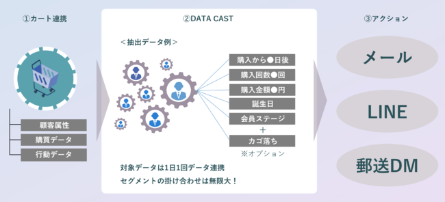「DATA CAST」は、ECサイトで保有している会員情報や購買データ等を組み合わせてセグメントを行い、”個客”一人ひとりにあったコンテンツやタイミングに合わせてシナリオメールやLINEを送ることができるマーケティングプラットフォームです。