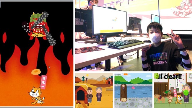 スクールは11月〜1月の3ヶ月間で合計6回開講されたもので、参加者たちはScratchは「ももたろうをテーマにオリジナルゲームを作る」を課題に、マインクラフトプログラミングは「プログラミングでおやつ作り」を課題に、スクール中とそれ以外の時間は自己学習によって、作品をブラッシュアップさせ、当日に臨みました。今回の参加者は24名。エントリーは31名でしたが、新型コロナウィルス感染症の影響でキャンセルもありましたが、参加者は学習の成果をそれぞれのゲーム作成で発表しました。