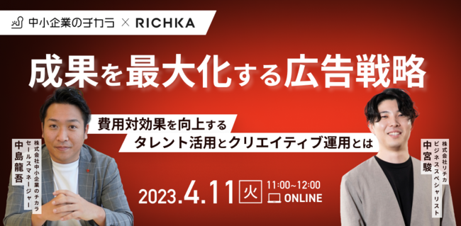 中小企業支援(ブランディング、WEB マーケティング、SDGs支援)事業を行う株式会社中小企業のチカラ(本社:東京都渋谷区、代表取締役社長:山下 佳介、以下「中小企業のチカラ」)( https://smes-chikara.co.jp )は株式会社リチカと「成果を最大化する広告戦略」について2023年4月11日(火)11時よりウェブセミナーを開催いたします。