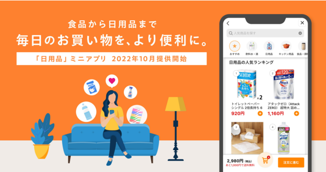 「日用品」ミニアプリでは、「LOHACO」の商品を取り扱います(※4)。重くてかさばる飲料やお米、トイレットペーパーなど毎日の暮らしに必要な日用品をミニアプリで、スピーディーかつお得に購入できるようになることで、共働き世帯や高齢者の増加などによる、インターネット通販の需要を取り込んでいきます。