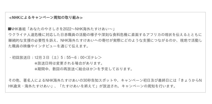 日本赤十字社(本社:東京都港区、社長:清家 篤)は2022年12月1日(木)から12月25日(日)まで、「NHK海外たすけあい」を実施いたします。