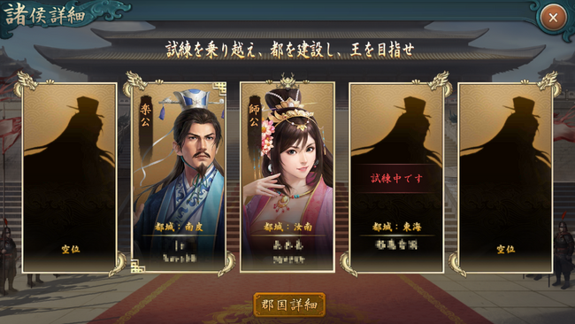 「諸侯試練」は自立為王の追加コンテンツで、ストーリーが「第二回 諸侯割拠」まで進行すると開放されます。自軍団の都城を守り抜き、試練に成功すると「王」または「国公」となり、相応の権限と都市建設機能を獲得できます。自軍団が本国に郡城を3つ保有していると、試練への挑戦が可能となります。今回のアップデートにより最大で5軍団が挑戦できるようになります。