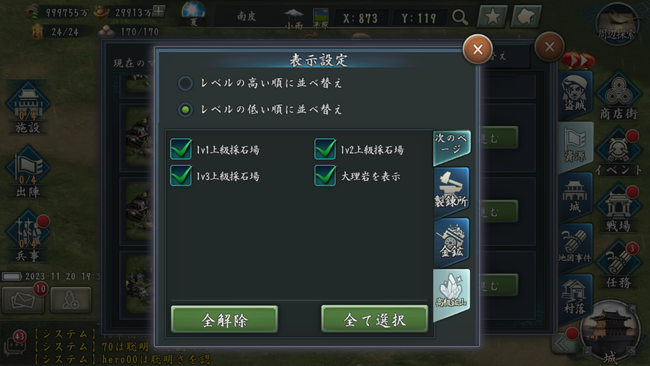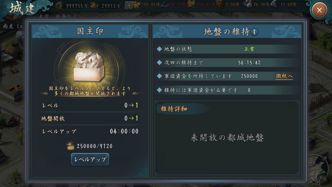 政庁のレベルが60に到達するか君主レベルが75に到達すると、新資源「大理石」が開放されます。大理石は将作府で採石場を上級採石場にアップグレードすると採集可能になります。また、君主レベルに応じて高ランクの大理石を採集できるようになります。