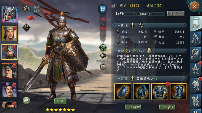 資質が130以上でレアリティがUR以上の武将のランク上限を45まで開放