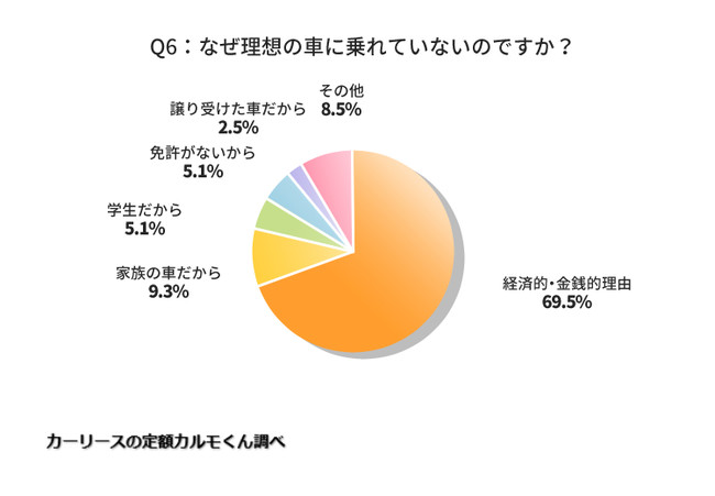 「理想の車に乗れていない」と回答した方々に、なぜ理想の車に乗れていないのかを聞いたところ、69.5%という高い割合で「経済的・金銭的理由」という理由があがっていました。次いで「家族の車だから」「学生だから」などがありました。