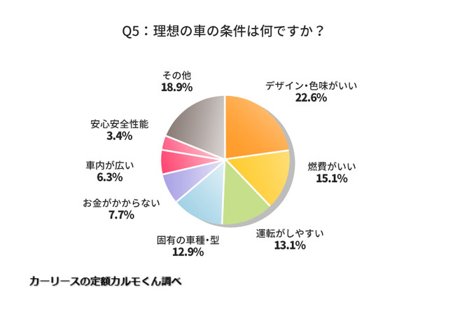「自家用車を持っている」と回答した方に理想の車の条件を聞いたところ、「かっこいい」「かわいい」などを含む「デザイン・色見がいい」が最も多く、続いて「燃費がいい」となりました。この燃費は「お金がかからない」(7.7%)と合わせると経済的であることが理想的だという回答が1位になる結果になりました。